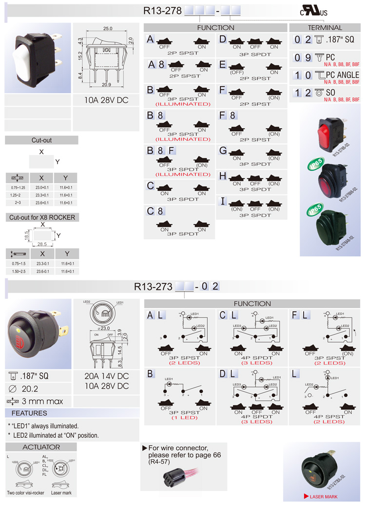 R13-66A.A5.A8: 2P SPST ON-OFF R13-66B.B2.B6: 3P SPST ON-OFF (LED or LAMP) R13-B4.B8: 3P SPST ON-OFF (LED) R13-B8F: 3P SPST (ON)-OFF (LED) R13-66C.C8: 3P SPDT ON-ON R13-66D: 3P SPDT ON-OFF-ON R13-66E: 2P SPST ON-(OFF) R13-66F.F8: 2P SPST (ON)-OFF R13-66G: 3P SPDT ON-(ON) R13-66H: 3P SPDT ON-OFF-(ON) R13-66I: 3P SPDT (ON)-OFF-(ON) R13-66IP: 4P SPST ON-OFF (LED) R13-66L: 4P SPST ON-OFF (LED)