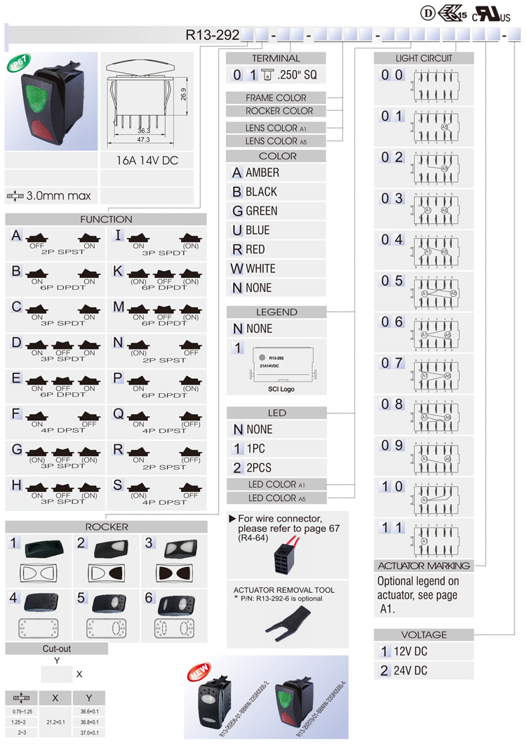 R13-290AL: 4P SPST ON-OFF (LED) R13-290CL: 5P SPDT ON-ON (LED)