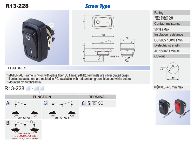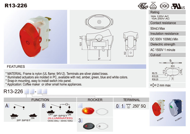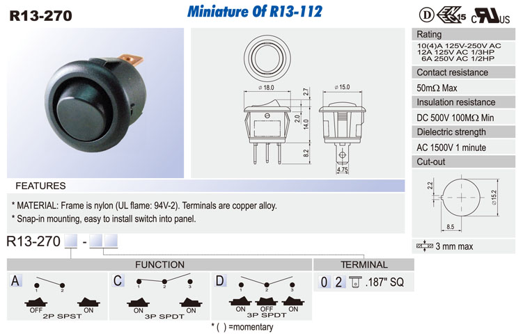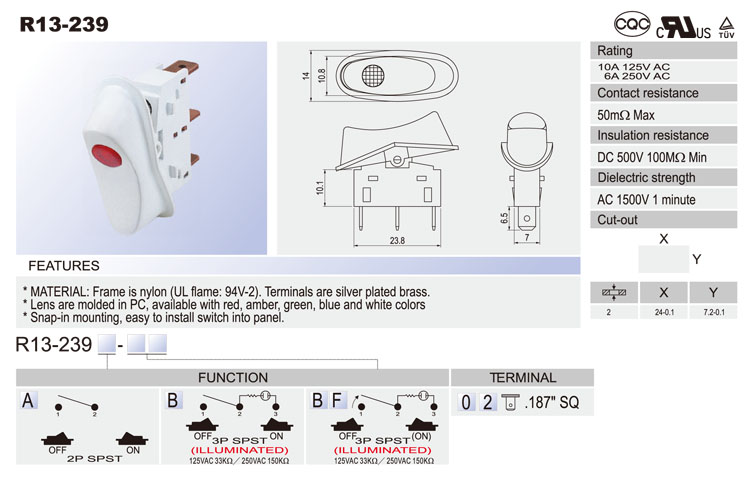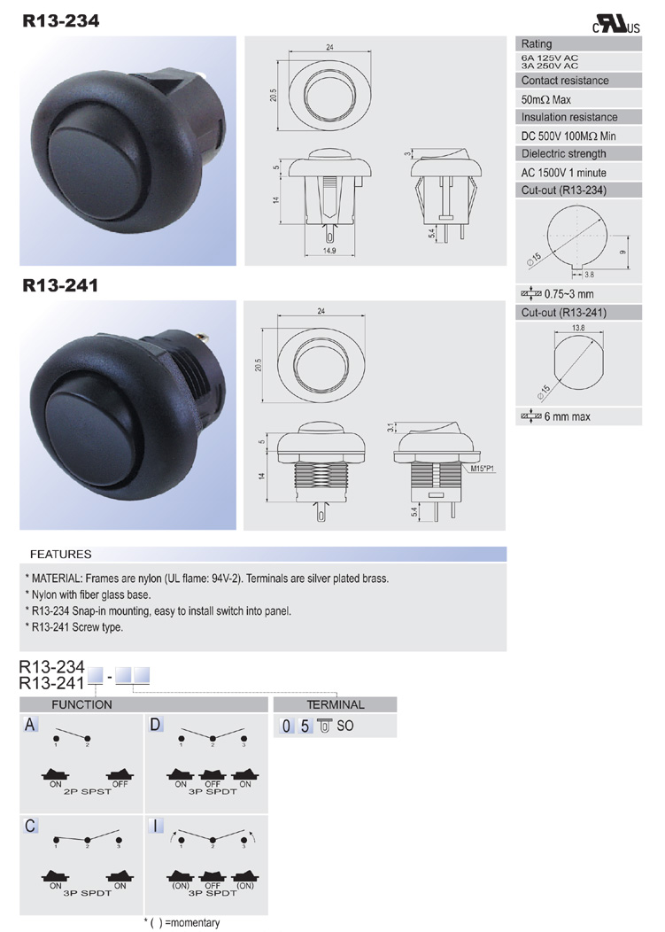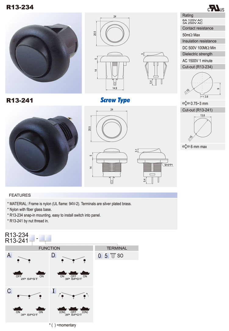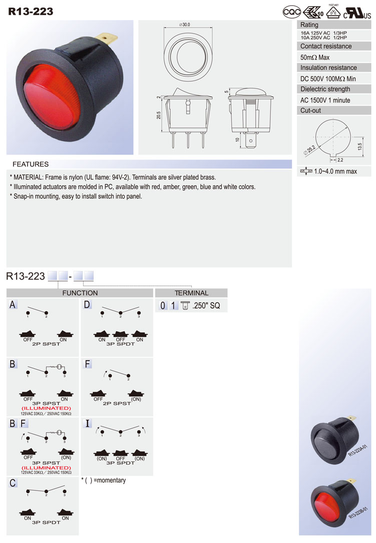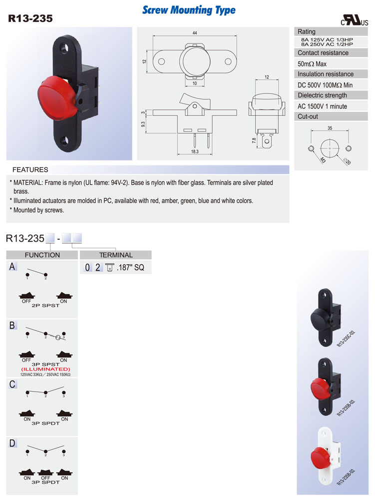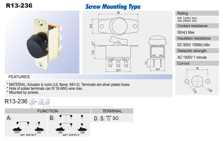R13-238A: 2P SPST off-on R13-238C: 3P SPDT on-on R13-238D: 3P SPDT on-off-on R13-238B: 3P SPST (neon) off-on R13-238B2: 3P SPST (LED) off-on (w/o lens) R13-238BF: 3P SPST (neon) off-(on) R13-238B2F: 3P SPST (LED) off-(on) (w/o lens) R13-238F: 2P SPST off-(on) R13-238I: 3P SPDT (on)-off-(on) R13-238A8: 2P SPST off-on (waterproof) R13-238B8: 3P SPST (neon) off-on (waterproof) R13-238B8F: 3P SPST (neon) off-(on) (waterproof) R13-238C8: 3P SPDT on-on (waterproof) R13-238D8: 3P SPDT on-off-on (waterproof) R13-238F8: 2P SPST off-(on) (waterproof) R13-238I8: 3P SPDT (on)-off-(on) (waterproof)